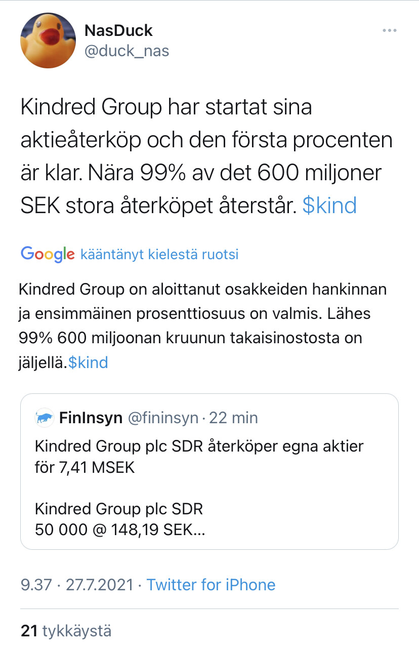 EDIT 6.8.2021: Tässä taas näkee, että kyllä nuo Nordean kaverit (mielestäni hoitaa ostot) tietää paremmin. Näin jälkikäteen, hyvä että lähdettiin rauhassa ostamaan osakkeita, koska tavoitteena on kurssin nostamisen sijaan, saada halvalla osa yrityksestä takaisin ja parantaa EPS. Onkohan kuitenkin jokin “kipupiste” milloin omien ostoja lähdetään kiihdyttämään? Esimerkiksi jos tulee eilisen kaltainen Kambin rykäisy alaspäin. Tämä taisi kuitenkin olla täysin Nordean käsissä, ja yhtiön johto ei voinut vaikuttaa ostoihin.