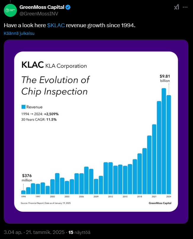 Katsotaan herättääkö viimeisin mielenkiinnon kohteeni foorumilla kiinnostusta. Kyseessä siis puolijohdeteollisuuteen laitteita ja palveluita tarjoava SP500 indeksiin kuuluva yritys. KLA:n juuret juontavat 1970-luvulle ja nykyinen yritys syntyi KLA Instrumentsin ja Tencor Instrumentsin yhdistyessä 1997.