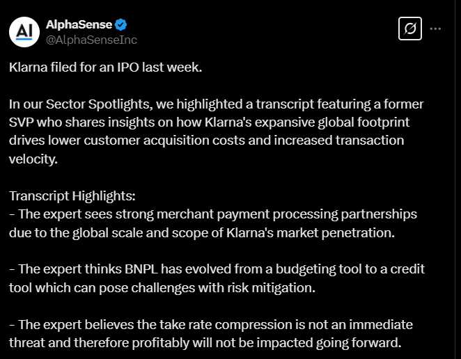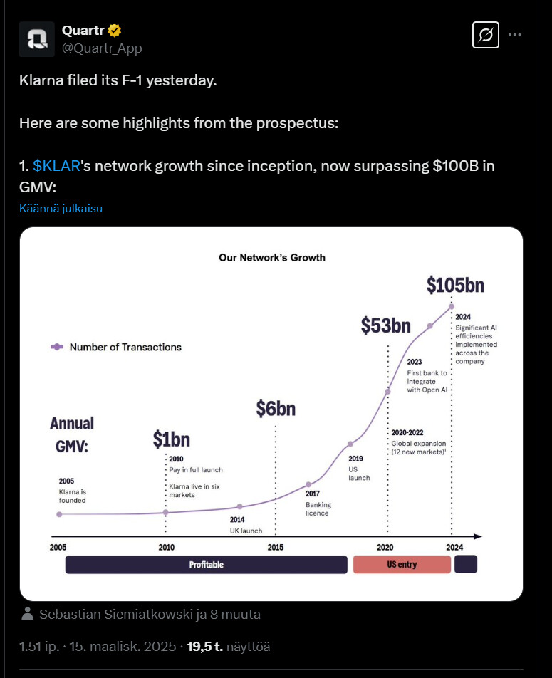Tässä alla on tviitti liittyen siihen, miten Klarna jätti listautumishakemuksen viime viikolla. Tviitissä oli muutamia hyviä nostoja mm.