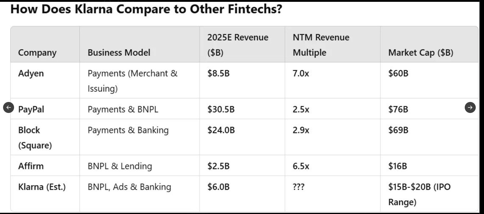 Alla olevassa jutussa osin päällekkäistä asiaa edellisen viestin kanssa, mutta jotain uuttakin. Tosiaan Klarna hakee New Yorkin pörssilistauksessa 1,27 miljardin dollarin “rahoitusta”.