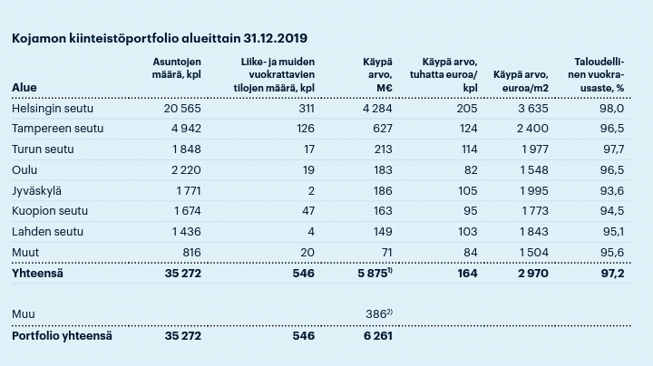 Ei liene sattumaa, että kiinteistöportfolio on ainakin vuokra-asuntojen puolesta melko keskittynyt pääkaupunkiseudulle ja muihin kasvukeskuksiin. Tuosta Jessen kirjoituksesta sai sen kuvan, että sijainnilla olisi merkitystä, ei ainoastaan kiinteistöjen arvonnousun kautta, mutta myös vuokra tuottojen kasvun kautta. Täytyy todeta, että kiinteistösijoitusyhtiöistä itse pidän Kojamoa vähäriskisimpänä juuri tuon valtavan asuntomäärän vuoksi tässä markkinassa. Mielenkiinnolla odotan H1:n lukuja.