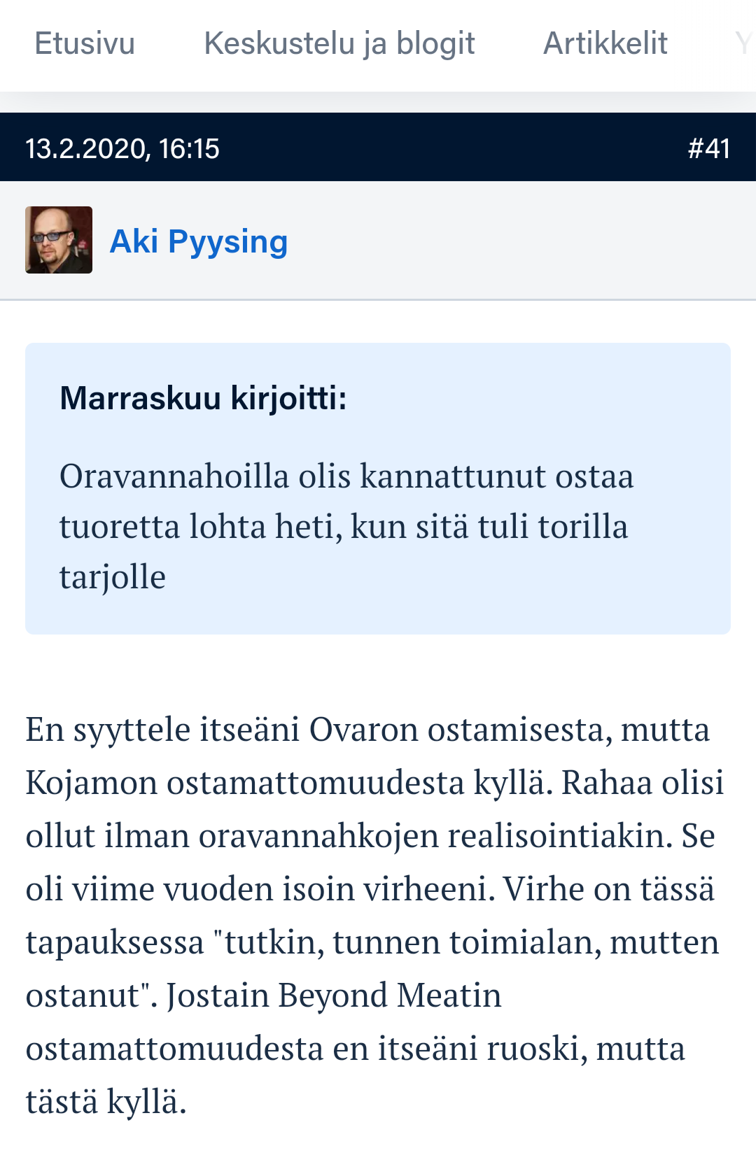 Oksanharju oli ilmeisesti tarkistellut OMXH25 firmojen ulkomaalaisomistuksia hiljattain. Kojamo oli ollut yksi neljästä yhtiöstä, jonka ulkolaisomistus oli kasvanut. Tähän lienee vaikuttanut myös se, että se hiljattain nousi vasta indeksiin, mutta onneksi nousi.