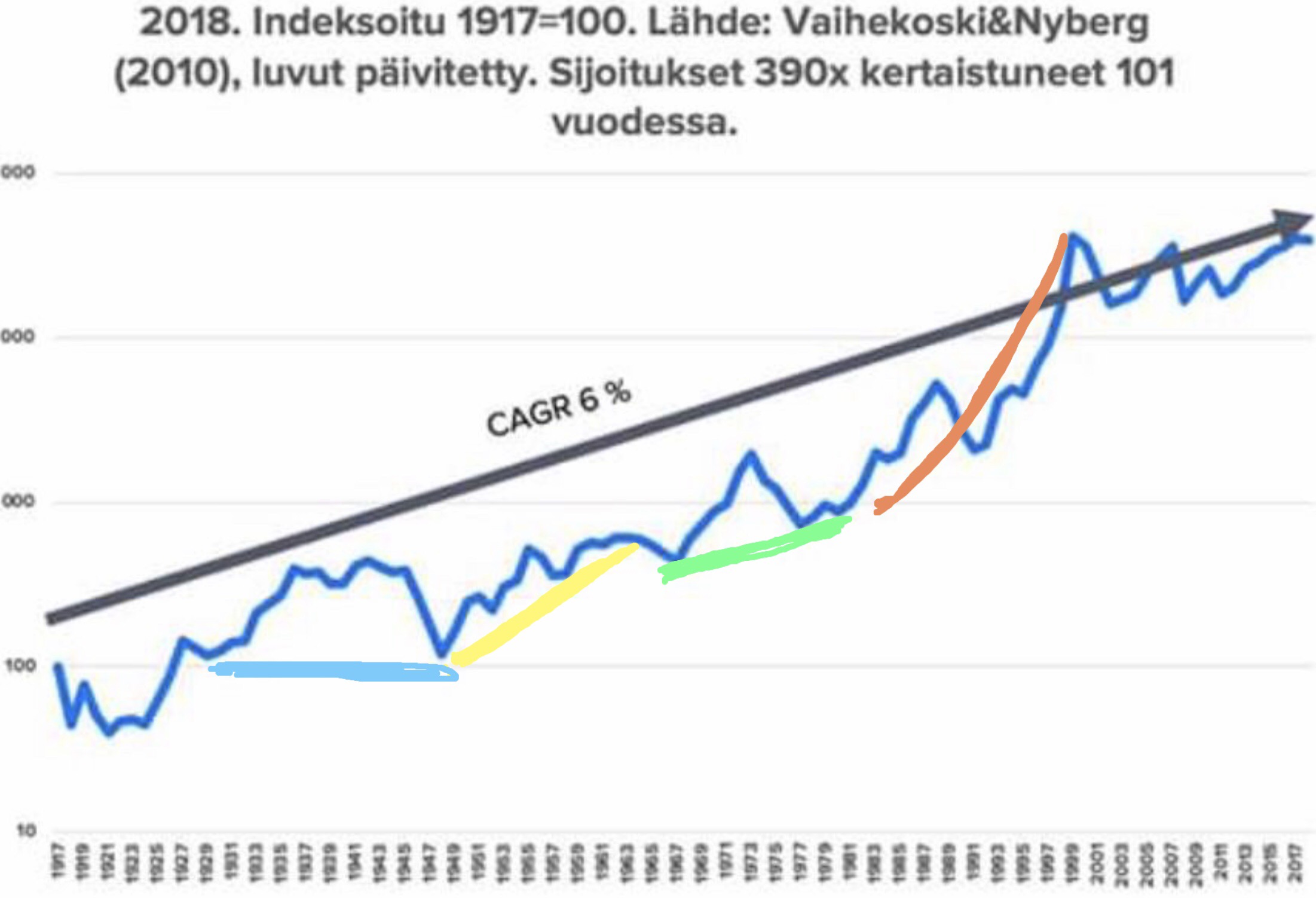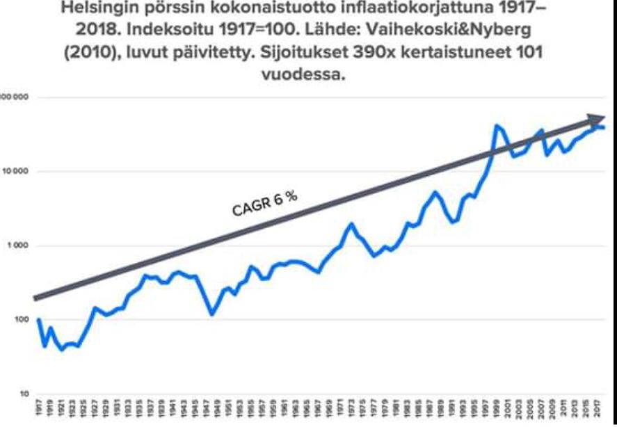 Tuon perusteella K-kevään aikana osakkeiden kokonaistuotto on Helsingissä 7-8 kertaistunut lähtötilanteesta ja K-syksyn aikana ehkä 30-kertaistunut (tai ainakin useampikymmenkertaistunut, laittamastasi logaritmisesta asteikosta on vaikea arpoa sokkona tarkkaa lukemaa)