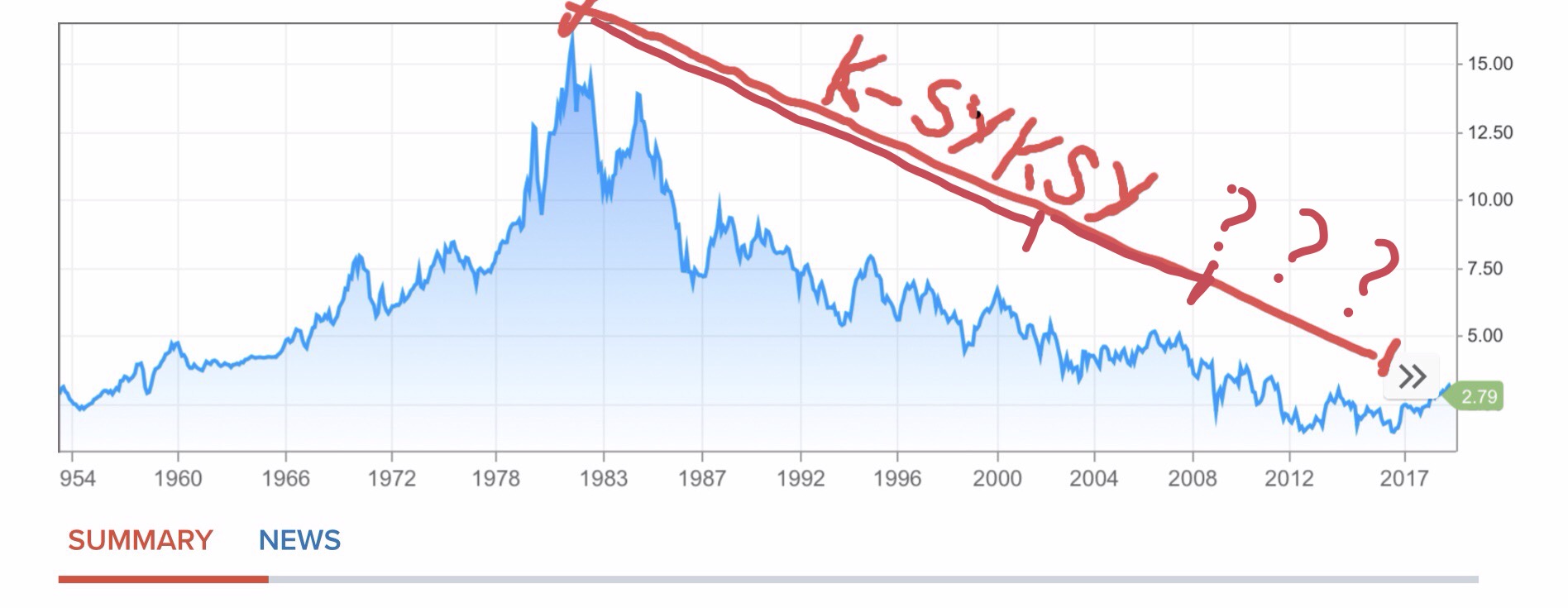 Korot olivat korkeimmillaan vuonna 1982, jolloin K-syksy alkoi. Siitä lähtien korot ovat laskeneet, eli K-syksy on ollut päällä. Nyt alkaisi siis olla seuraavaksi edessä aika, jolloin siirrytään Kondratieffin talvehtimismoodiin, jolloin velan kiihtyvälle lisääntymiselle tulee päätepysäkki.