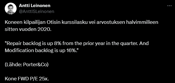 @Antti_Leinonen:n tviitti, joka kiinnostanee tässä ketjussa, koska siinä kerrotaan, että Otisin arvostus on laskenut halvimmilleen sitten vuoden 2020, mutta Kiinan heikkous peittää koko muun maailman kehityksen, joka on parantunut.