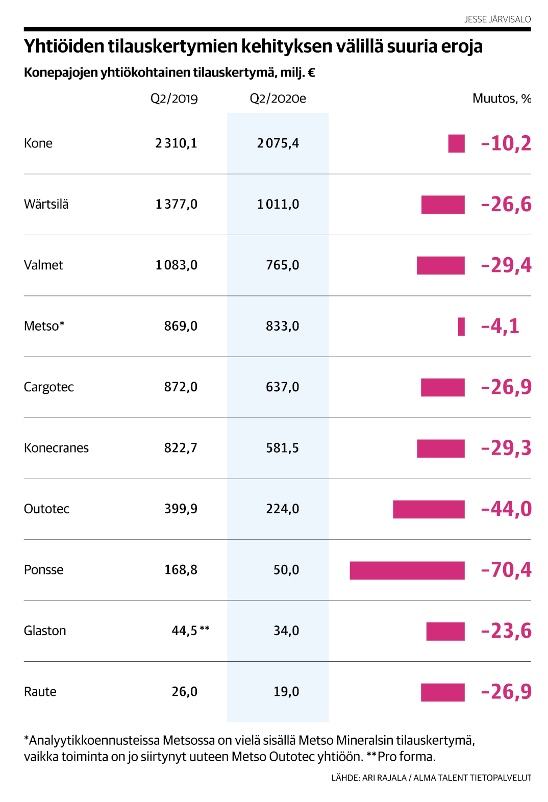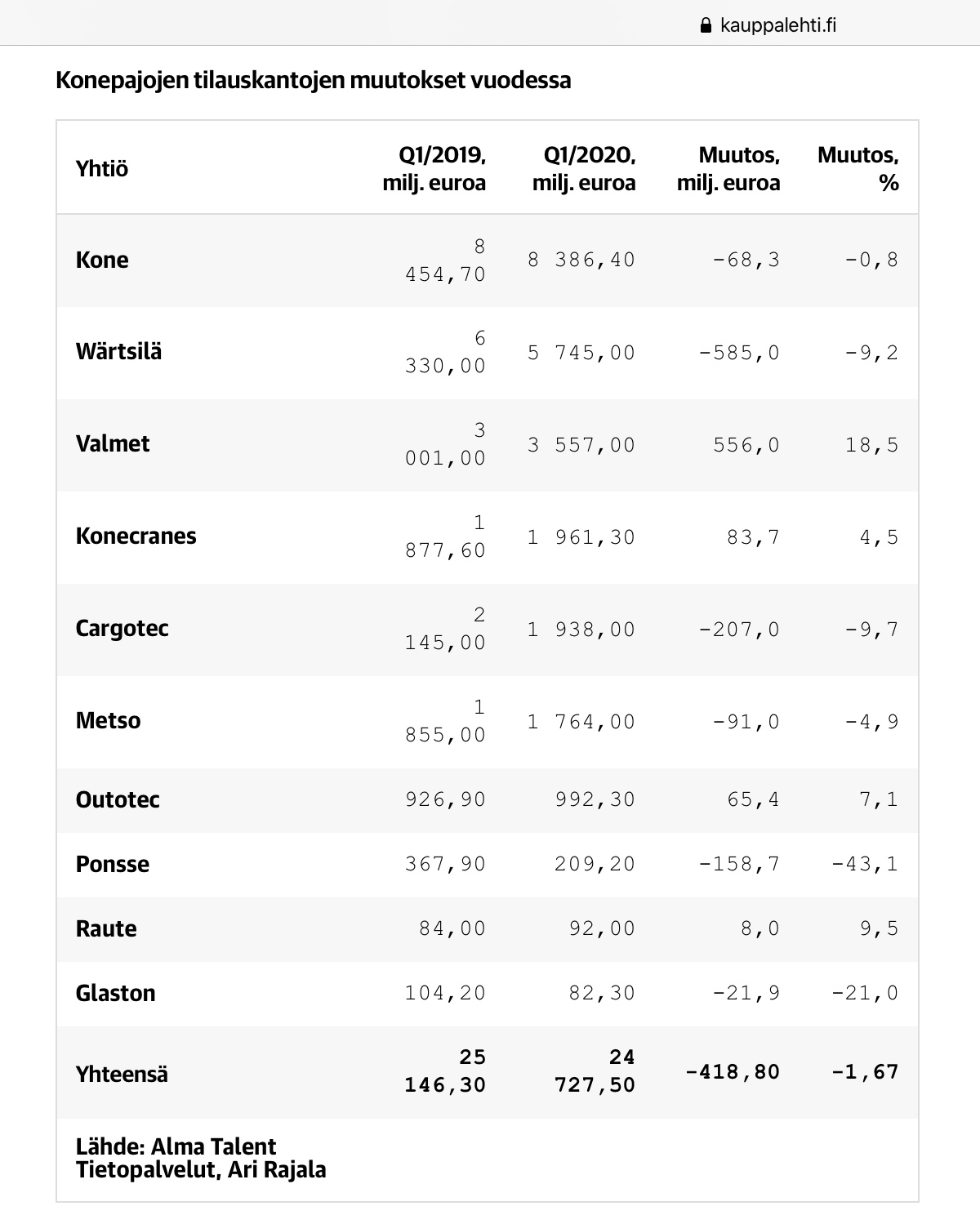 Huomisesta Kauppalehdestä poimittu konepajojen tilauskertymän kehitys, Q2/2020 vs. Q2/2019. Kovin rumalta näyttää tuo Ponsse.