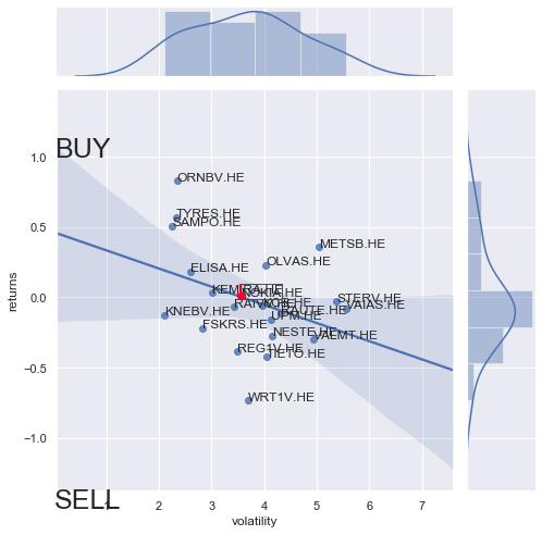 Eli mitä vähemmän punaista sitä rauhallisempaa ja riskittömämpää liikehdintä on ollut. Punaiset kuvaavat ylläolevan kuvan pisteitä ja sininen hintatasoa.