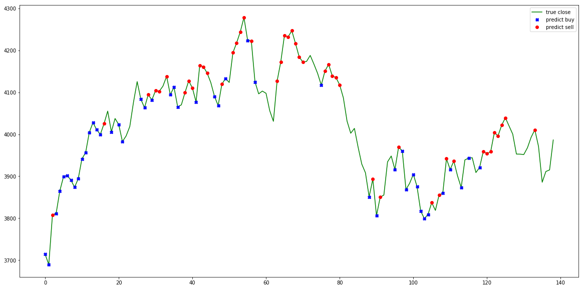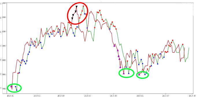 Tämä riippuu algosta mikä on käytössä. Mikäli algo perustuu anomaliteetteihin hinnassa ja pyrkii normaalistasoon, eli siis tunnistaa ääripäät hinnassa ja myy tämän perusteella, outputti voisi näyttää seuraavalta:
