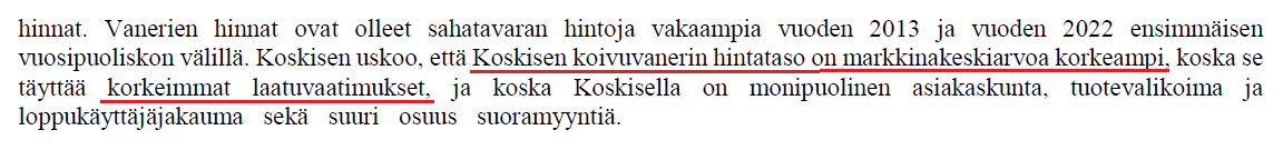 Der er brug for vortebirk af god kvalitet, da kvalitet også er en central konkurrenceparameter inden for krydsfiner. Ifølge side 86 i Koskisens prospekt opfylder Koskisens birkekrydsfiner de højeste kvalitetskrav og muliggør dermed et højere prisniveau.