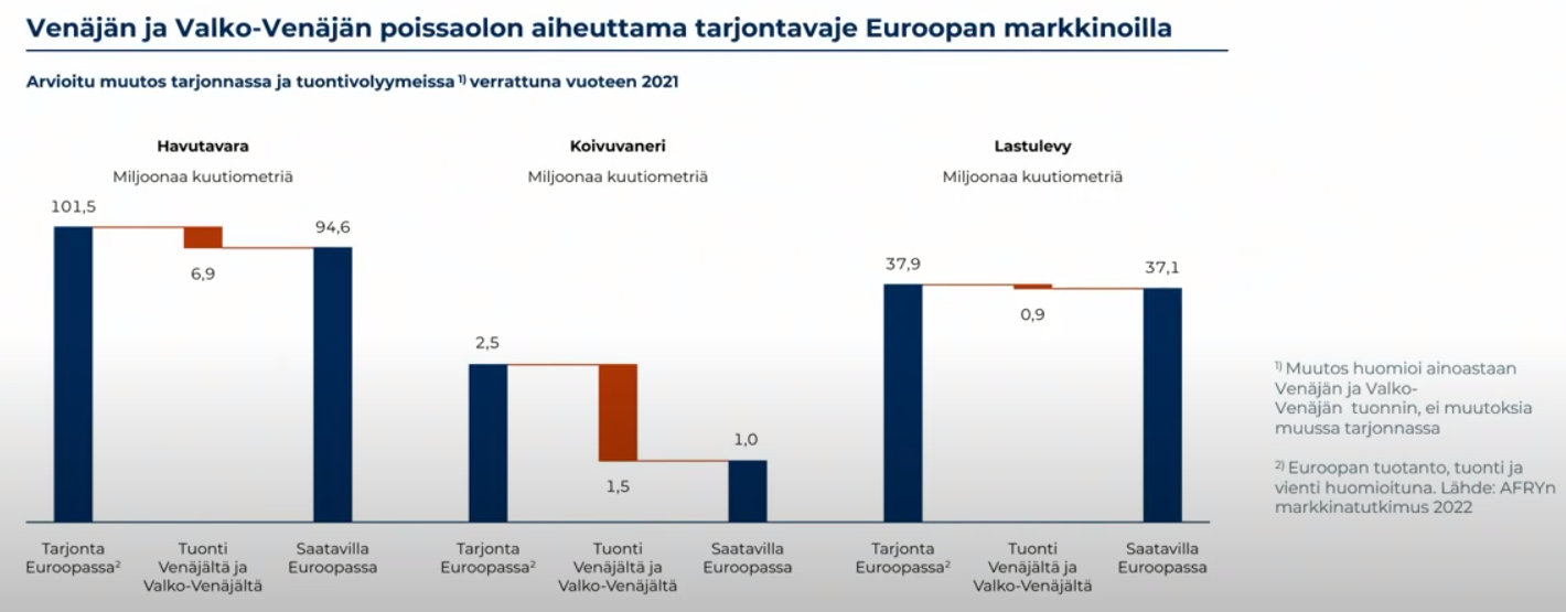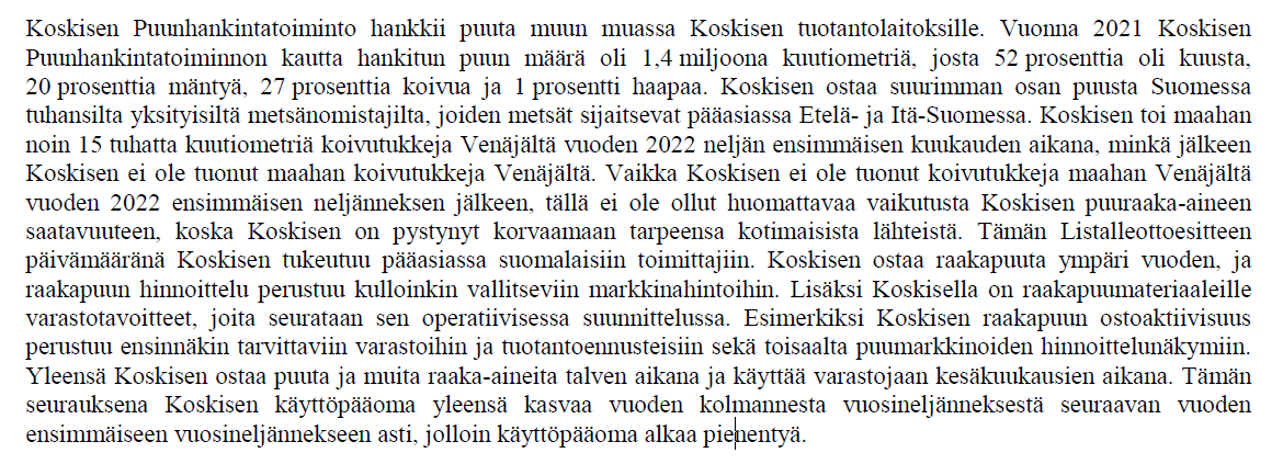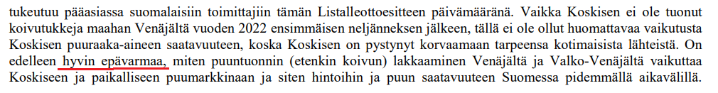 Ifølge prospektets s. 50 var mængden af løvtræskævler, som Koskisen importerede fra Rusland i 2021, ca. 44.000 kubikmeter, og traditionelt er en mindre del af Koskisens birkekævler primært blevet importeret fra Rusland.