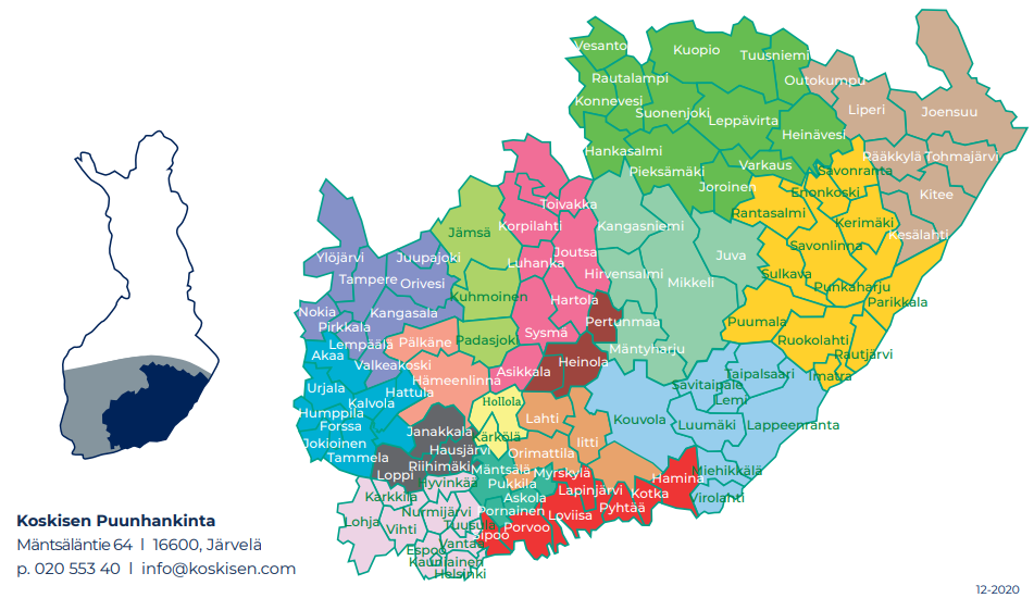 Koskisens indkøbsområde omfatter netop disse 9 største regioner og Kymmenedalen. Der ser således ikke ud til at være nye indkøbsområder for birkekævler i Finland, som Koskisen Oy kunne udvide sit træindkøb til.