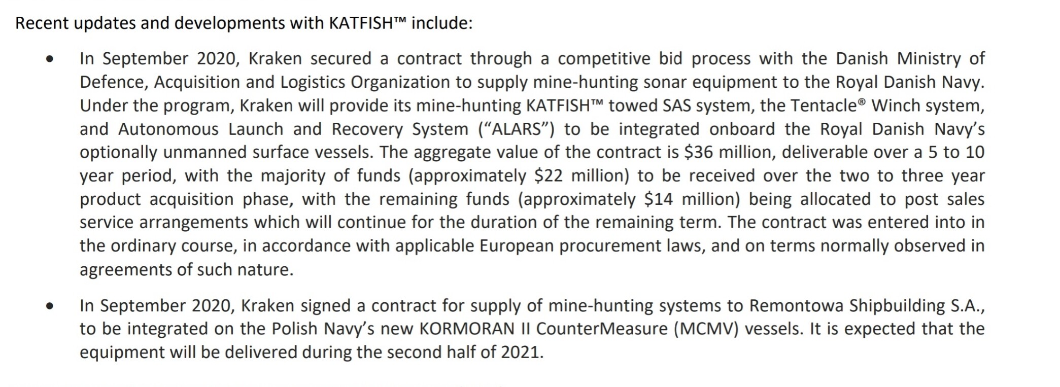 Näköjään Klein Marine Systems, joka on Mind Technologiesin tytäryhtiö, kärsi tappion. Tämä on kiinnostavaa, koska ilmeisesti hype Mindin ympärillä rakentuu paljon sen varaan, että luvassa olisi kauppoja jenkkilaivaston kanssa. Tämä tosin vaikuttaa ainakin hieman epätodennäköisemmältä jos Kraken nappaa pienempiä diilejä naaman edestä. Tanska ja Puola kuitenkin myös NATO-maita. Luulisi myös, että jenkkilaivaston rahakkaista diileistä olisivat kiinnostuneet isommatkin firmat.