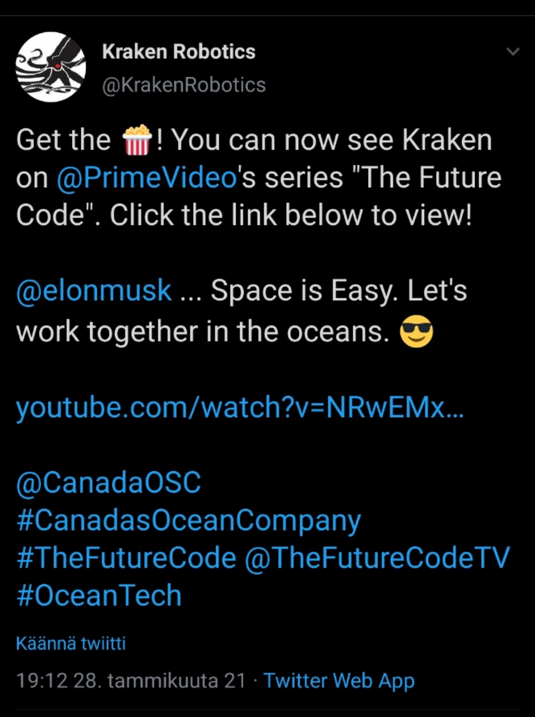 Kurssi osoitti elon merkkejä pitkästä aikaan ja tästä varttitunnin videosta tuli Kraken mieleen. En suoraan sanottuna edes muista liittyvätkö Krakenin toimet merenpohjan kaivostoimintaan.