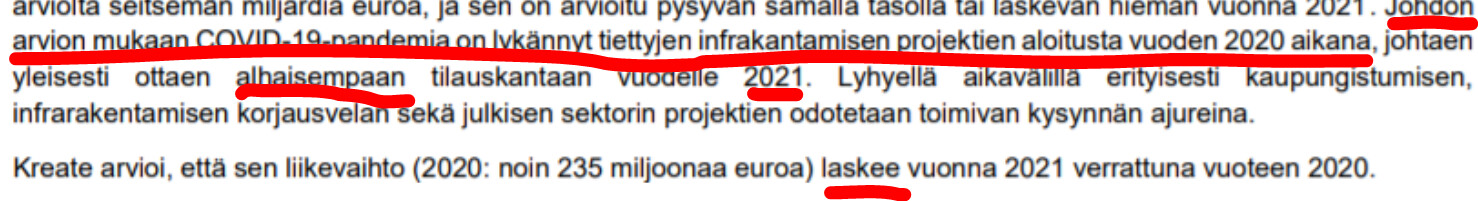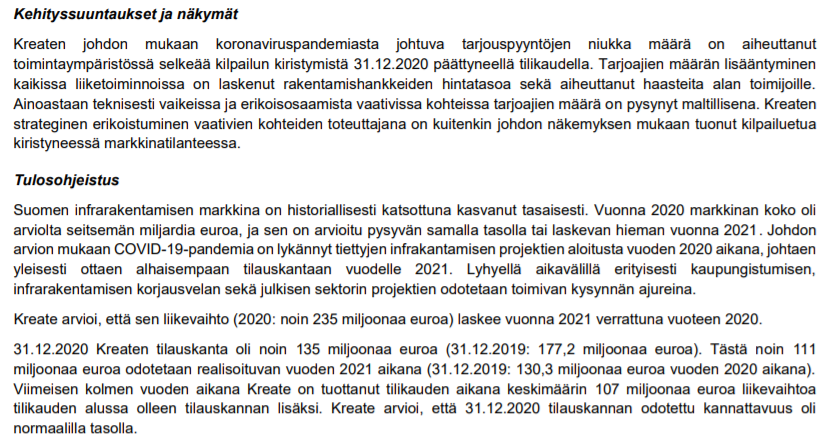 Tällä hetkellä varsinkin pks-seudulla, ja tilanne varmasti samankaltainen muuallakin maassa, markkinatilanne on haastava. Korona on vienyt kunnilta rahat, ja pks-seudulla kaupungit ovat laittaneet hankkeita jäihin. Valtion urakoista en osaa sanoa sen tarkemmin, mutta mutulla voisin sanoa että sielläkin mennään säästöliekillä. Kilpailu urakoista on nyt todella tiukkaa, tarjoajia on todella paljon, ja hinnat vedetty tosi tiukille. Eli kuten firman sivuilla lukikin, tämän vuoden liikevaihto myös Kreatella tulee varmasti laskemaan. Kreate on sen verta iso tekijä että perinteisissä ja pienemmän mittakaavan katu- ja kunnallisurakoissa pärjääminen heillä tulee vastaisuudessakin olemaan hankalaa. Markkinoilla on nyt niin paljon ylitarjontaa, ja pienemmätkin kaivuliikkeet tarjoavat noita pikku-urakoita, että vaikuttaa urakkahintoihin. Tilanne no täysin sama esim GRK Infralla joka on yksi Kreaten kovimmista kilpailijoista.