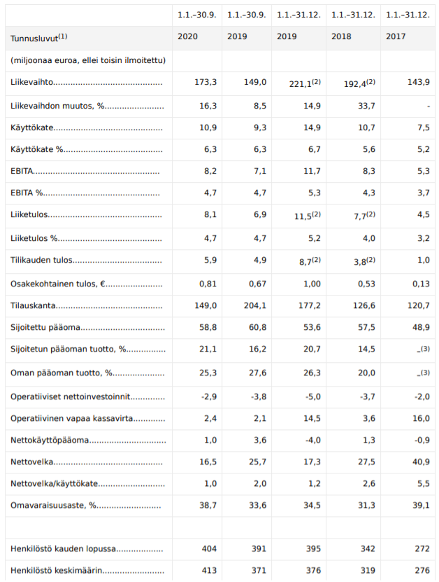 För att undvika att behöva göra H1/H2-jämförelser på det sättet meddelar de redan i pressmeddelandet att omsättningen 2020, enligt preliminära uppgifter, skulle uppgå till 235 miljoner euro, med ett EBITA på cirka 10,5 miljoner euro (4,5%). Jag uppfattade också att omsättningen år 2024 skulle vara just den summan på 300 miljoner euro, inte 2023. I vilket fall som helst, om den är 300 miljoner euro 2024, skulle det motsvara en genomsnittlig årlig tillväxt på cirka 6,3%. Detta skulle också ganska väl motsvara tillväxten från 2019 till 2020 (221 miljoner euro → 235 miljoner euro, 6,33%).