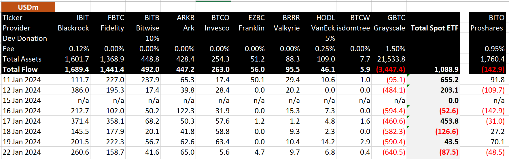 GBTC:n volyymi oli lähes täysin ulospäin kun vuoden 2023 parhaan treidin (mikä näkyy tuossa yllä) tehneet sijoittajat kotiuttivat voittojaan kun Grayscalen fund konvertoitui ETF:ksi. Siinä on selvästi isommat kulut kuin kilpailijoissa ainakin toistaiseksi, joten osa on varmasti myös vaihtanut halvempaan tuotteeseen. Tämän perusteella osa kryptoanalyytikoista on valittanut avauspäivän olleen pettymys, mutta tuo on ihan turhaa spekulointia. Katsotaan rauhassa mille tasolle nämä volyymit ja rahavirrat asettuvat.