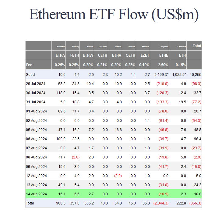 Rahavirrat spot Ethereum ETF:iin ovat kääntyneet elokuun aikana jo positiivisiksi, kun Grayscalen rahasto-osuuksien dumppaus on vähentynyt.