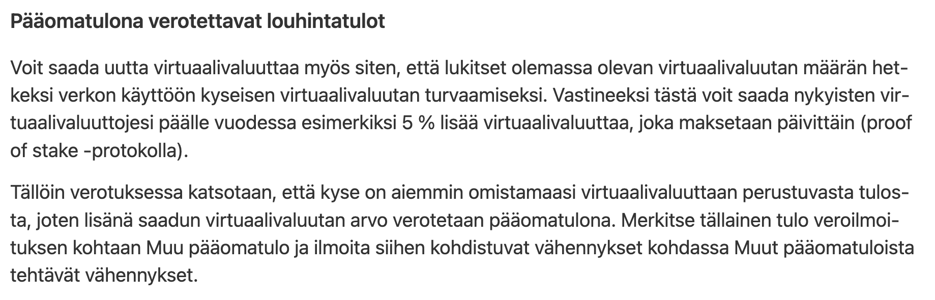 Staking-tuotot ovat muuta pääomatuloa, eivät luovutusvoittoja (ennen kuin ne myydään, mistä realisoituu luovutusvoittoa tai -tappiota)