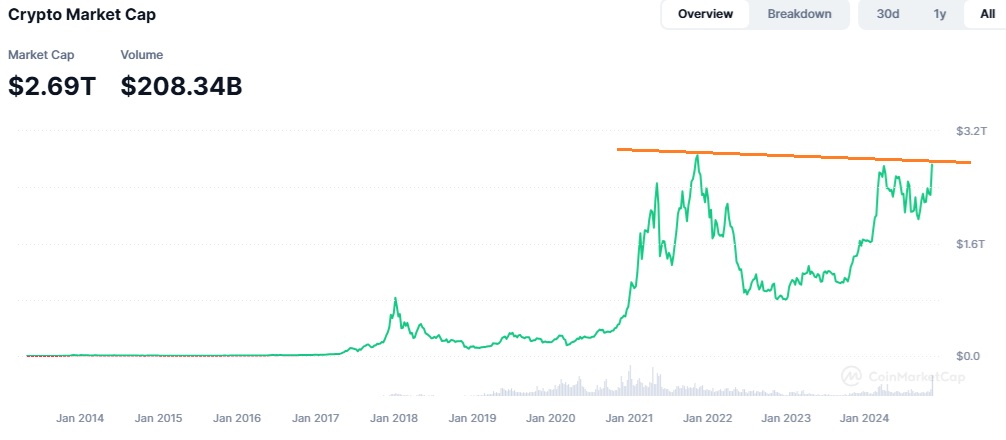 Tämä on täysin väärä tulkinta. Hyvin harva kolikko on itseasiassa ath:ssa. Kokonaismarkkinan suuruutta selittää todella iso Bitcoin dominanssi ja Bitcoinin markkinahuiput, uusien kolikoiden tulo ja dilutaatio.