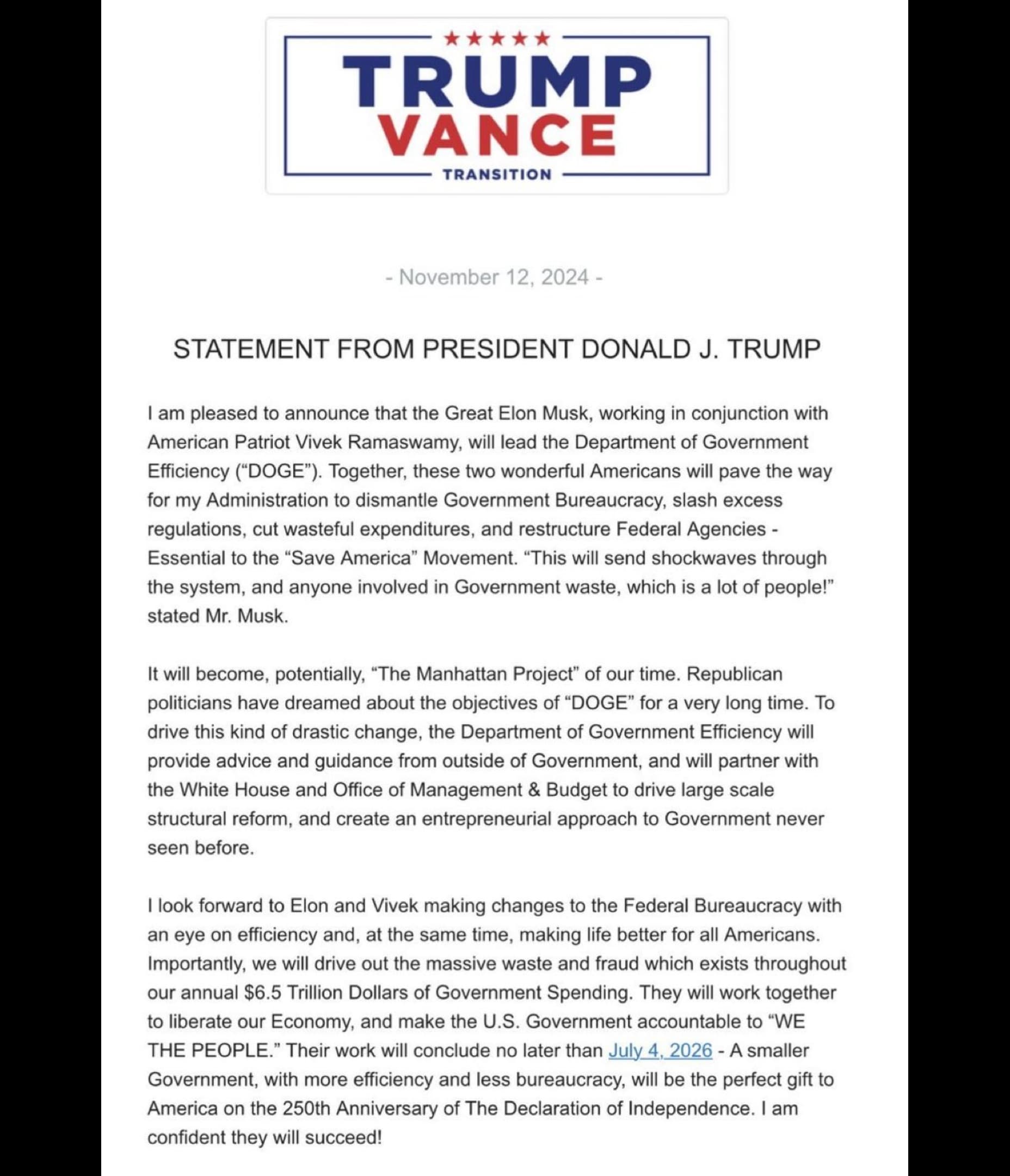The Department of Government Efficiency (DOGE) will be run by Elon Musk and Vivek Ramaswamy