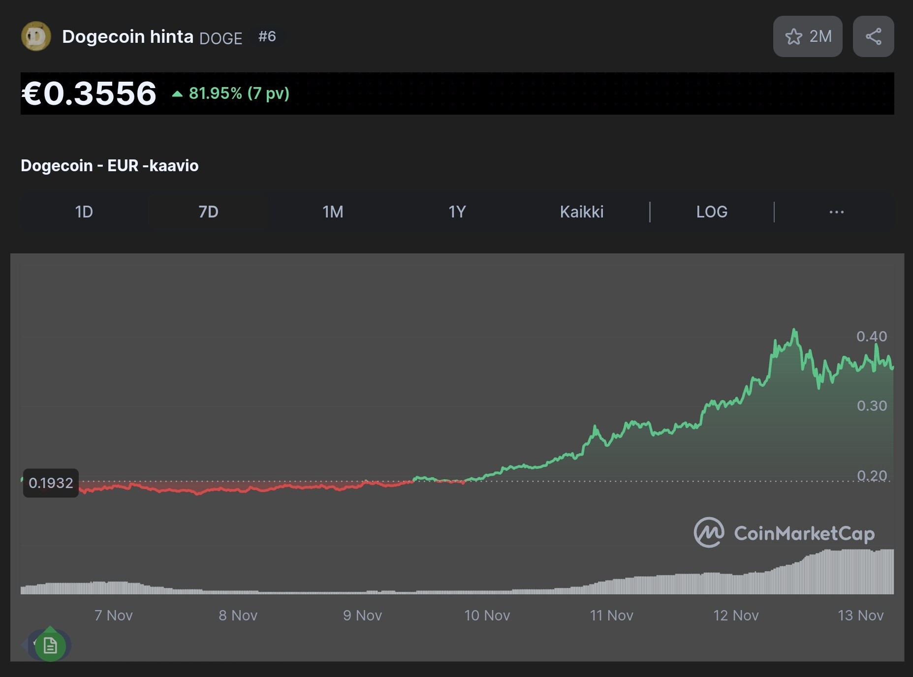 Edit: Top20:ssä vain Bitcoin ja Sui on kaikkien aikojen huipuissa. Esimerkkksi Polkadotilla sijalle 17:sta on matkaa vielä 900% uusiin huippuihin.