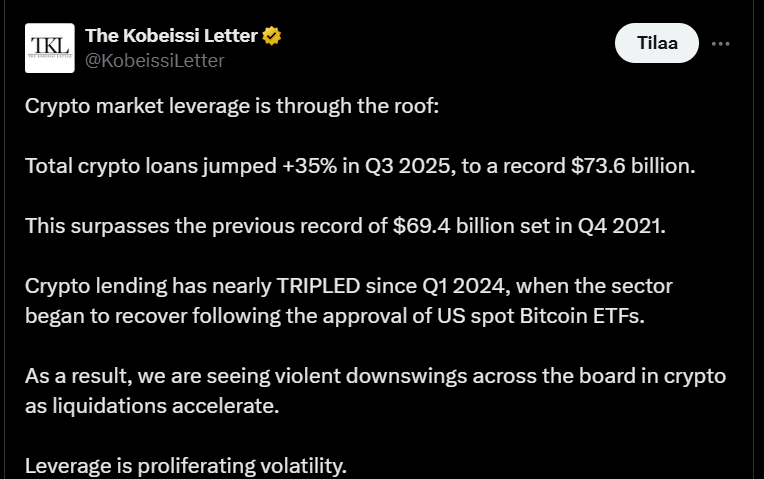 Kryptolainoja on nyt ennätysmäärät ja velkavipu markkinoilla on kasvanut muutenkin rajusti.