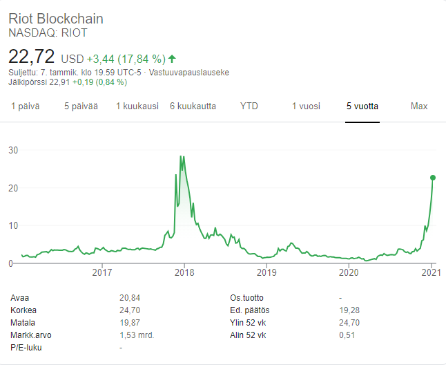 Treidikohteina kyllä, samoin esim. BITF,BTBT,HIVE/HVBTF,HUT(TSX),CAN - muitakin blockchainiin liittyviä tai suoraan coineihin sijoittaneita yhtiöitä on. Kantsii olla varovainen näiden swingaamisessa, itsellä vain intraday