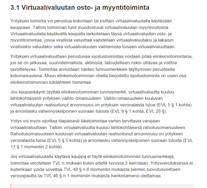Joo mulla on firman lompakko Coinmotionin kautta, ja kirjanpitäjän kanssa olen sopinut että laitan yhteenvedon kaupoista tilikauden päätyttyä. Toki Coinmotion ei sovellu kulujen takia aktiivisempaan treidailuun, mutta perustamishetkellä taisi olla ainoa Finanssivalvonnan hyväksymä välittäjä ja näin ollen päädyin siihen. Olen kuitenkin harkinnut siirtymistä halvempaan palveluun (esim. crypto.com), ja ainakaan verottajan näkökulmasta tässä ei näyttäisi olevan ongelmaa (tai ainakaan alla olevassa tekstissä ei oteta kantaa välittäjiin). Mutta kertokaahan muutkin, kellä on yrityksen kautta lompakkoja, että millä toimijoilla ja vaatiiko esim. kirjanpito tai verotus ylimääräistä työtä?