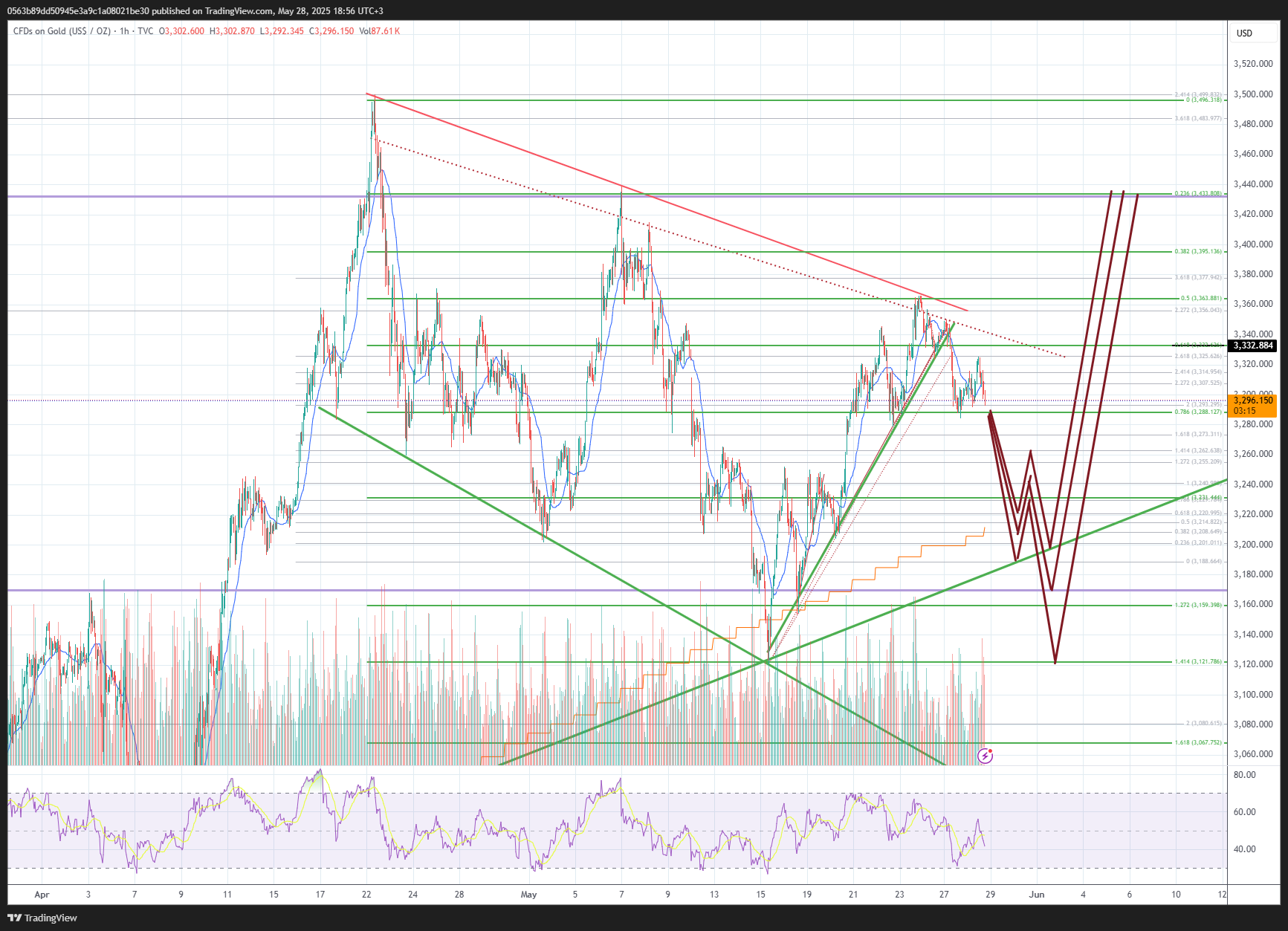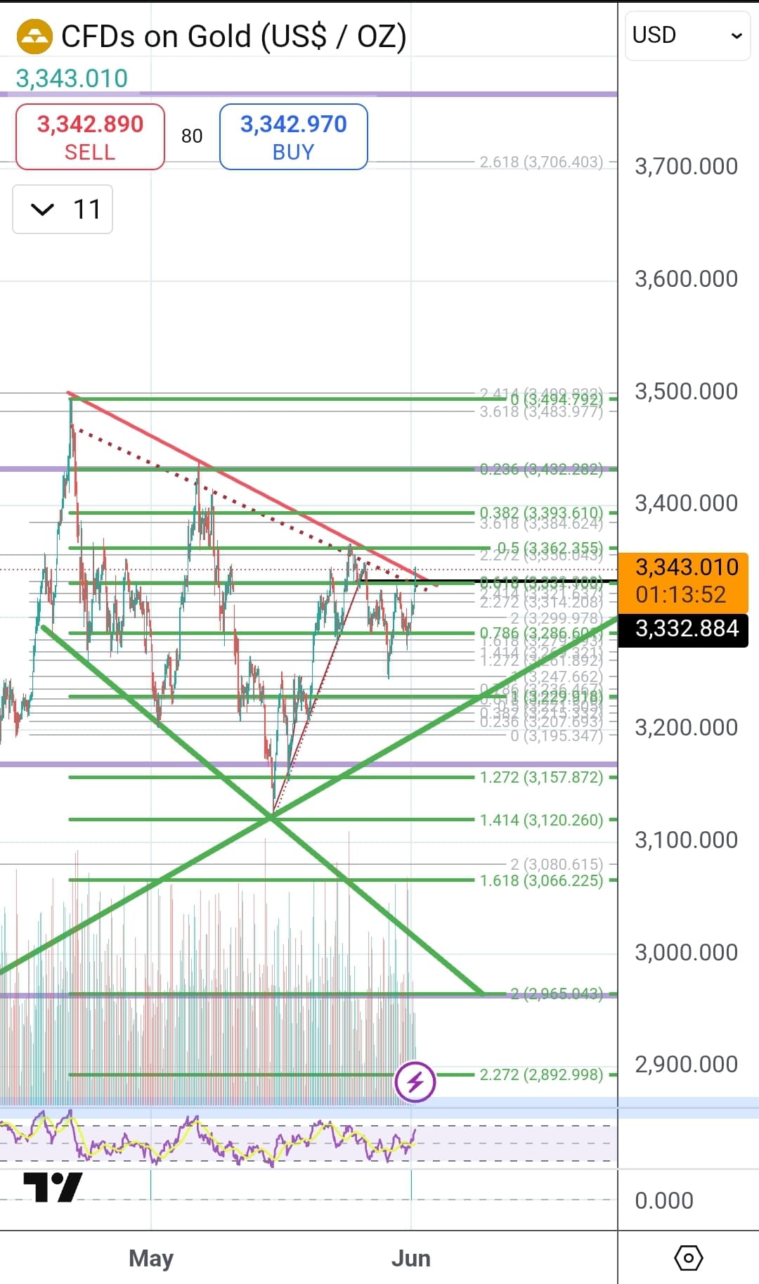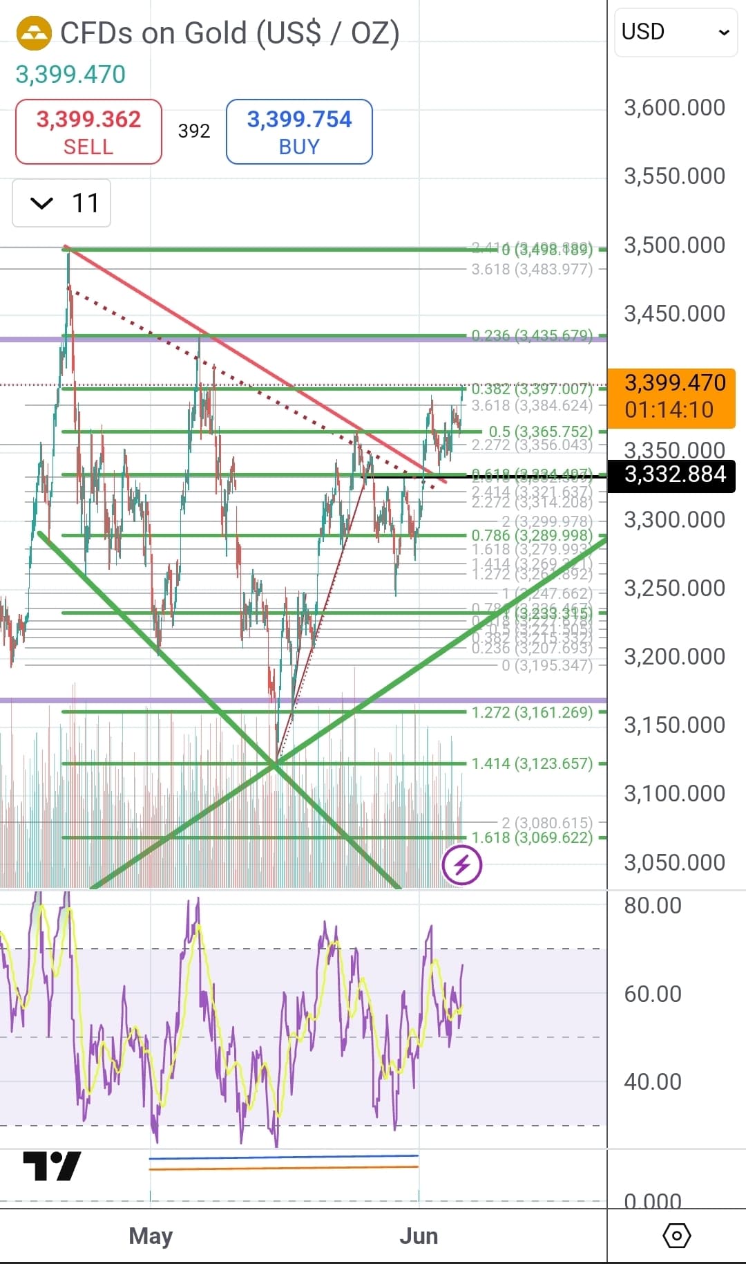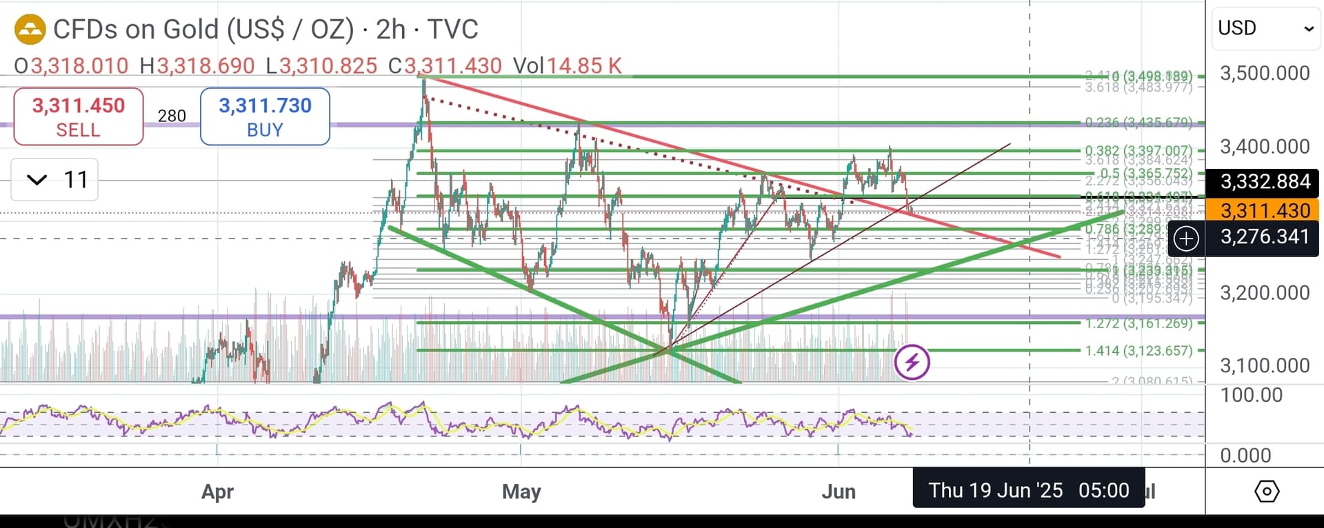 Onko kullan huiput nähty? Inflaatio laskee suuressa osassa maailmaa, eikä jenkkien markkinat enää näytä kaikelle suuntaa. Viimeisin nousu toukokuun puolestavälistä oli huomattavan epävarma aiempiin verrattuna. Korkeampaa tasoa ei saavutettu. Epävarmuus toisella nousulla näkyy myös esim. 3290 fibo-tasolla, jossa ensimmäisellä kerralla jäätiin pyörimään viikoksi, mutta toisella kerralla mentiin läpi yhden pompun kautta. Mites tällä kertaa? Jos tästä mennään selvästi alemmas ilman merkittävää pomppua, niin kultaoptimismi saattaa hälventyä kovaa.
