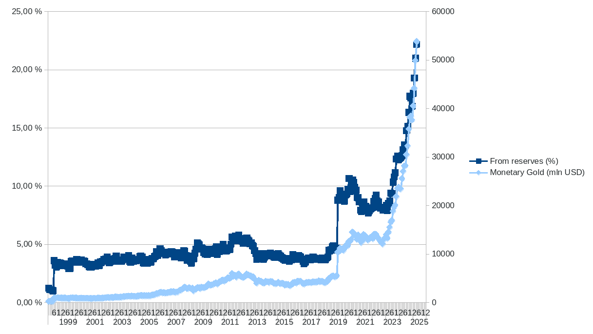 Tsekin keskuspankki on ollut Euroopan suurin kultareservien kasvattaja (suhteellisesti) viime vuosina. Ukrainan sodan alusta (2022) se on kasvanut muistaakeni viisinkertaiseksi (tonnia), siis verrattuna maaliskuu 2025. Keskuspankin verkkosivujen mukaan ovat sitoutuneet aikatauluun, että nykyinen määrä vielä kaksinkertaistetaan vuoden 2028 loppuun mennessä.