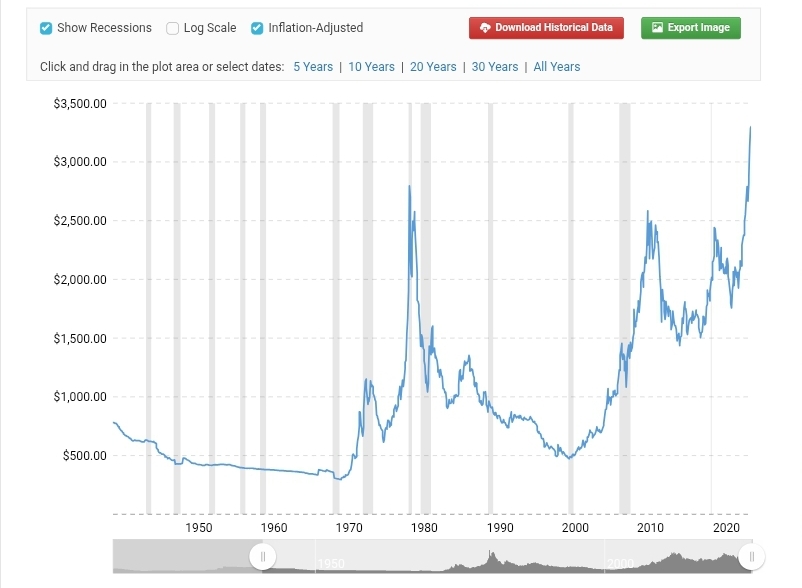 Tähän keskusteluun on kuitenkin hyvä muistuttaa miten 70-80 luvulla kävi kun inflaatiohuolet laski ja kun Afganistanin invaasion aiheuttamat huolet suuremmasta sodasta laantuivat. Alla olevassa kuvassa inflaatiokorjattu kullan historiallinen hinta.