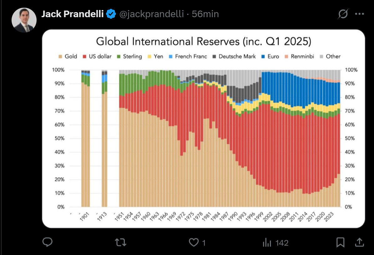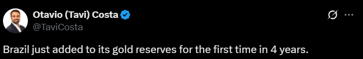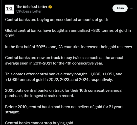 Det fremgår af tweetet, at centralbanker nu køber guld i et historisk højt tempo.