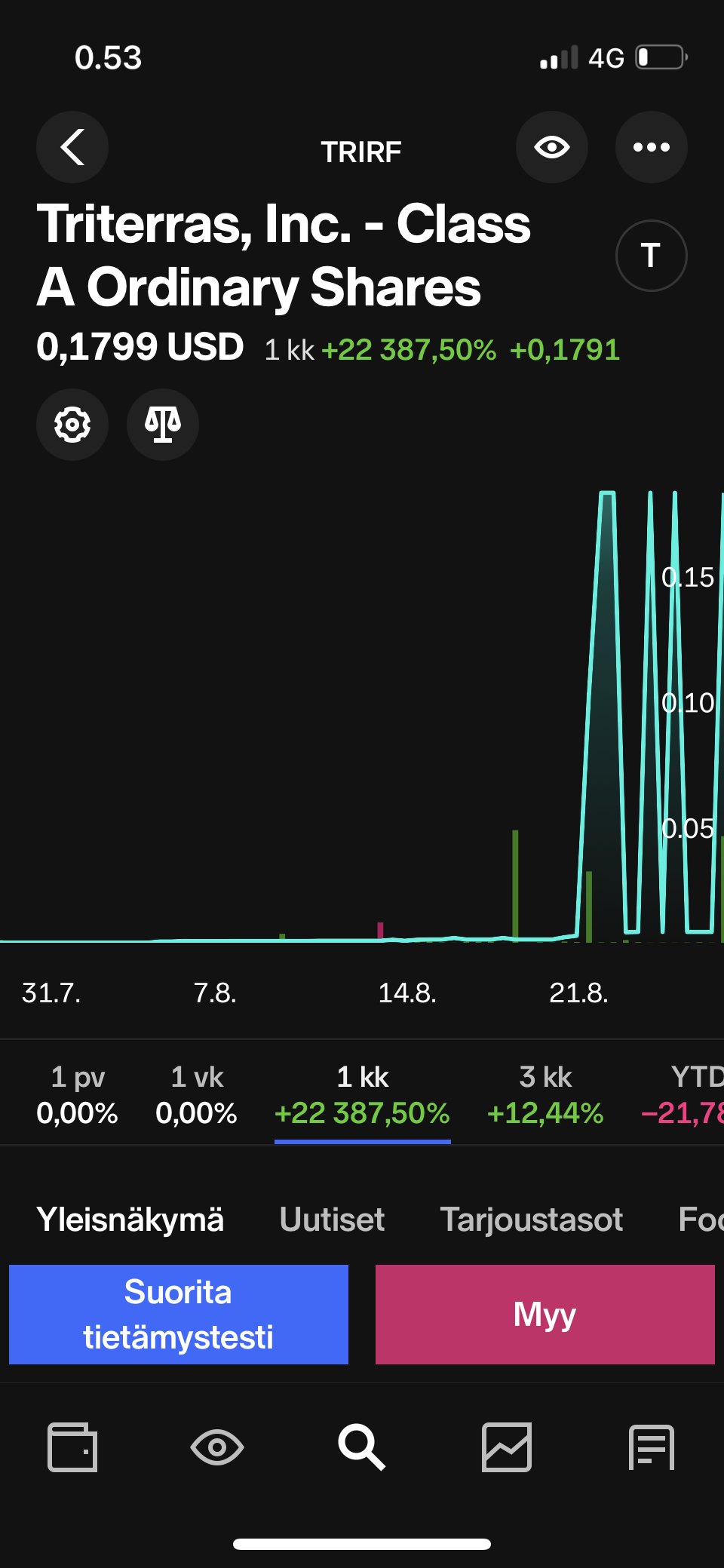 Tuli tarkistettua eilen, joko kusetus-spac Triterras on hävinnyt pörssistä. Tuli aika yllätyksenä tuo viime kuukauden nousuprosentti. Toki tippui melkein nollaan, eikä tuossa kovin monella lapulla ole kauppaa käyty, mutta komea vihreä luku kyllä