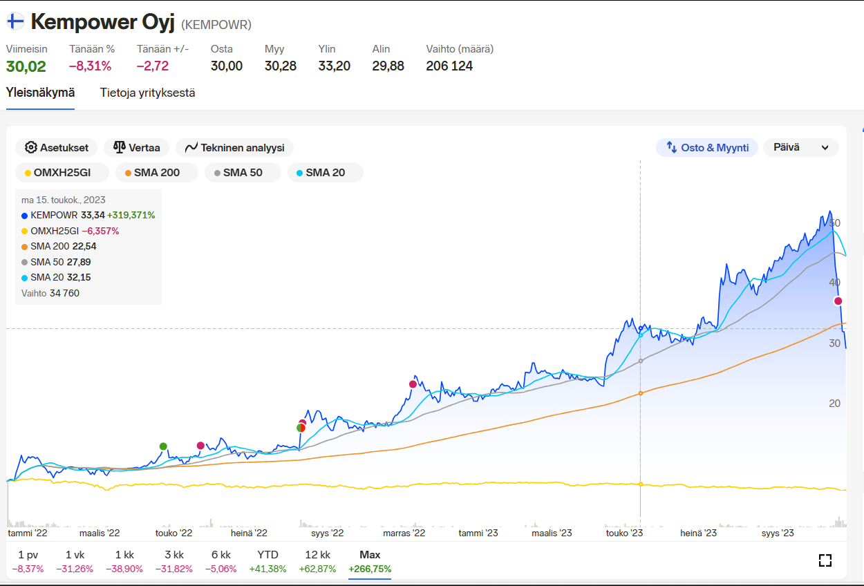 Speculation: Kemppiâs small free float was the reason for the strong rally, and now that same free float is also the reason for the decline. Time to put on the cut-resistant gloves and pull on the buying pants. Though, the speed of this drop does give one pause.