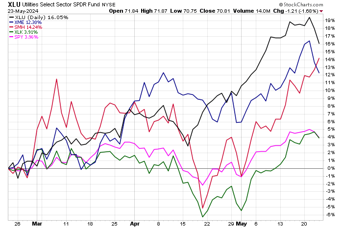 There has been some rotation into the utilities sector over the last 3 months, as XLUâs performance looks very similar over that period, but Fortum has just had greater leverage. XLU has otherwise been one of the best-performing sectors over the last 3 months, while XME and SMH were at roughly the same level. If we look at even narrower industries, GDX/SIL would clearly be in the lead (+30%/+45%), but I didnât include them there.
