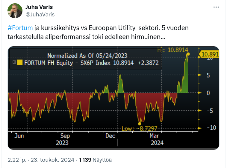 Juha Varis; Fortum and share price performance vs European Utility sector