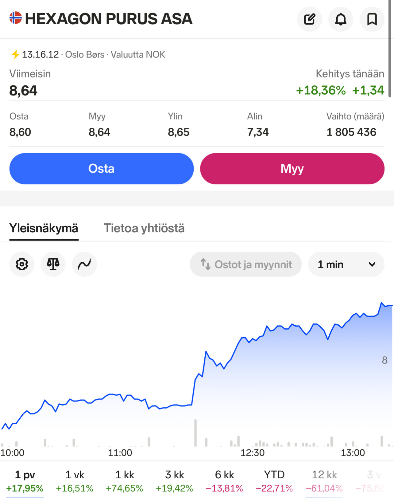 I was wondering what was lifting Herantis Pharma, and a block of >60K at @1.45 was eaten up in a few days⊠well, itâs clear now, and thanks for the help since I no longer have active credentials for Kauppalehti. ![]()