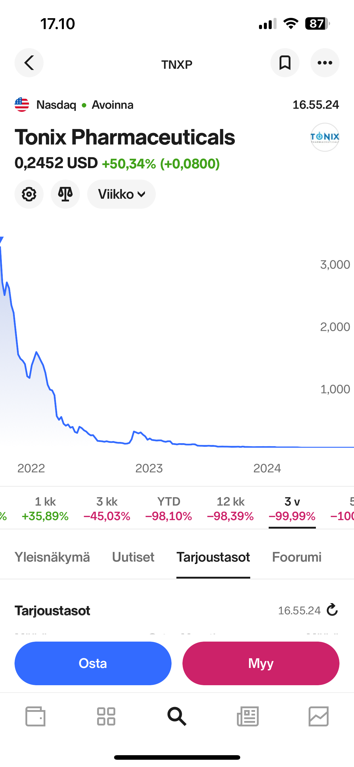 Ærgerligt i det hele taget, men man fik løbet efter de der små pharma-aktier i starten af sin investeringskarriere. Nordnet kan åbenbart ikke vise så gamle køb og salg på grafen. Set i bakspejlet kunne det være gået rigtig meget værre, når man rodede med de ting. Jeg havde nok heldet med mig, da alle de små pharma-aktier blev pumpet i 20-21, da der var masser af løse penge i markedet. Avinger, Jaguar Health, lige præcis den Tonix… de har alle ret heftige minusser siden dengang.