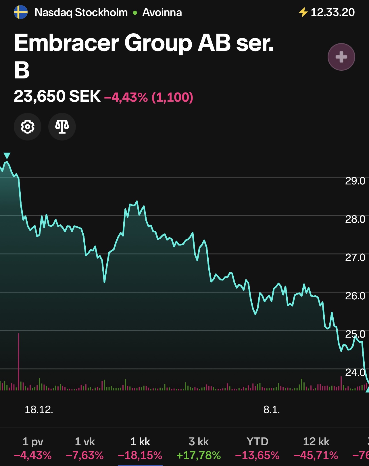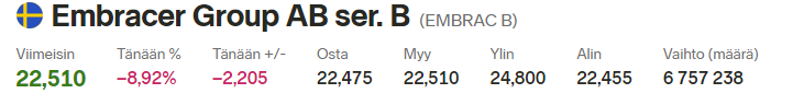 Embracerin omistaminen on kyllä ihanaa. Tänään taas mennään vauhdilla alas ja ei mitään käryä kenelläkään miksi. Osarikin tasan kuukauden päästä, joten hiljainen kausi käynnistyi. Shorttaaminen ja algot pitäisi kieltää lailla, kun ei tässä taas mitään järkeä.