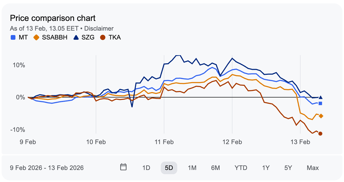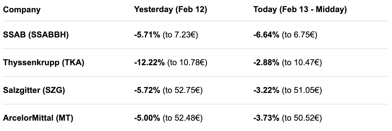 Edit: Thyssenkrupp publicerade sin rapport igår och kursen föll -12 %. Salzgitter och ArcelorMittal backar också. Jag antar att det hänger ihop med detta.