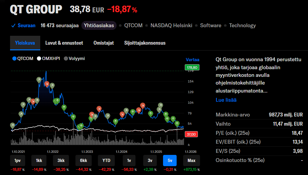 Ei tunnu ylimitoitetulta reaktiolta. Qt:n kurssi saa laskea vielä aika reilusti ennen kun kiinnostelee. Näyttää vaan entistä kalliimmalta kun tulosennusteet laskee reippaasti. Onneksi Qt on näyttänyt koko ajan kalliilta ja siksi ei ole ollut osto edes lähellä.