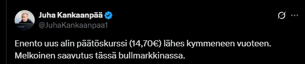 Juha Kankaanpään tviitti alokasmaisesta Enenton osakkeesta ![]()