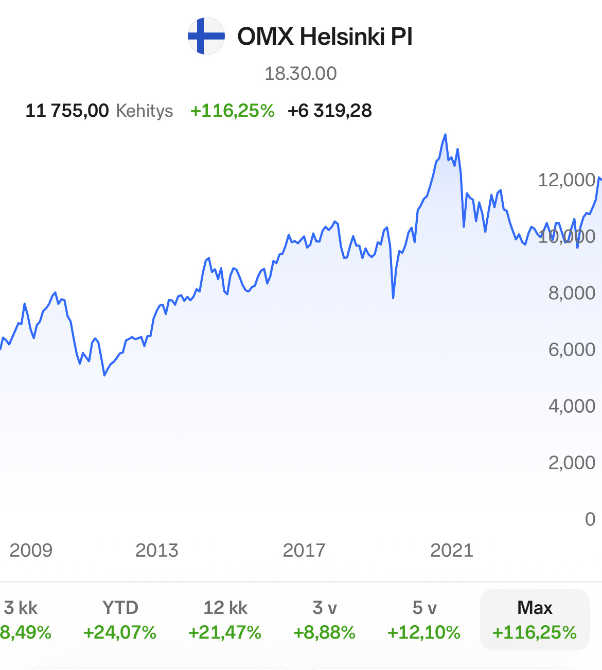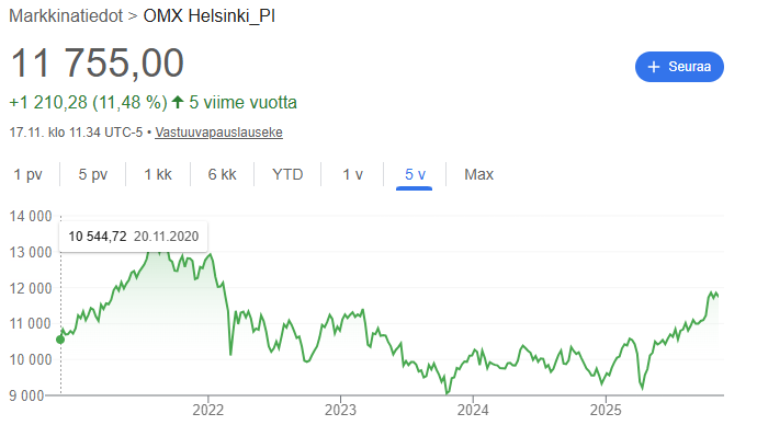 Omkring årtusindskiftets teknoboble var blandt andet Nokia, Bittium, Tietoevry samt cybersikkerhedsfirmaerne Withsecure og SSH på deres egne rekordniveauer. I midten af 2000’ernes boom, der førte til finanskrisen, kom kurstoppen, der forblev en rekordnotering, derimod fra Finnair, Telia og Lindex, dvs. tidligere Stockmann.”
