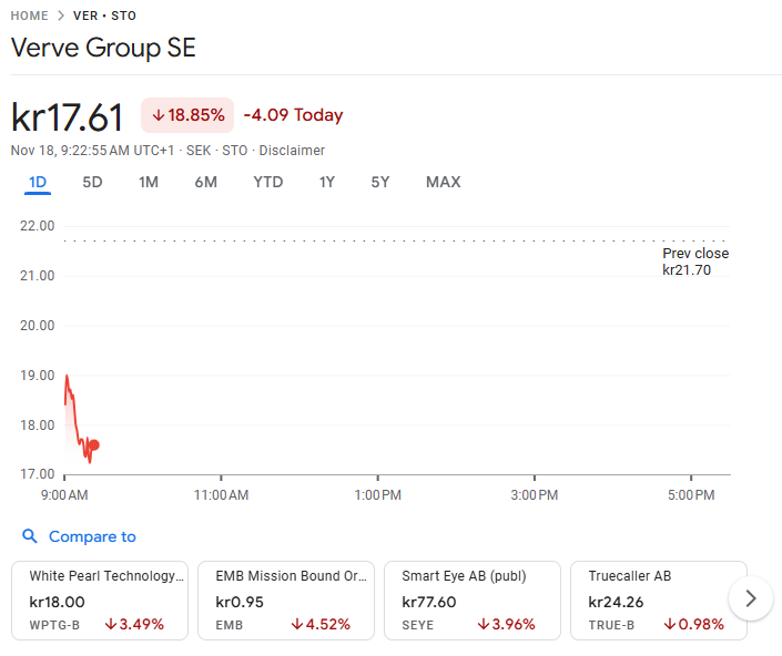 Verve starter som forventet med et dårligt kvartalsregnskab - 15 %. Denne vækstraket skyder mod 2025 med en stærk -50 % udvikling, og analytikere velsigner selvfølgelig kvartal efter kvartal med købsanbefalinger og høje kursmål. Aktiekursen er faldet fra 47 SEK til 17 SEK på et år. En uvirkelig ynkelig præstation, og man har kunnet lide enorme tab ved at være med på denne. Det er ikke nemt for aktieinvestorer at gætte, hvem der har ret med hensyn til anbefalinger for virksomheder og aktier, når den faktiske udvikling er noget helt andet end forventningerne hos dem, der professionelt følger selv dette selskab.