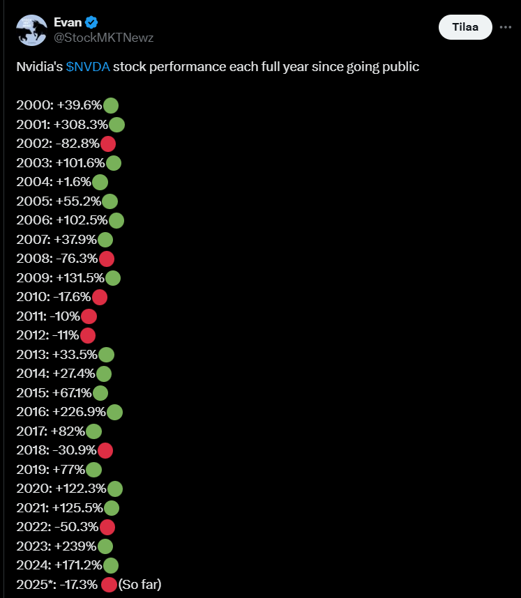 Nvidian kurssihistoria on mielenkiintoista; epätoivon hetkiä on ollut, mutta muunlaisia hetkiä ehkä enemmän. ![]()