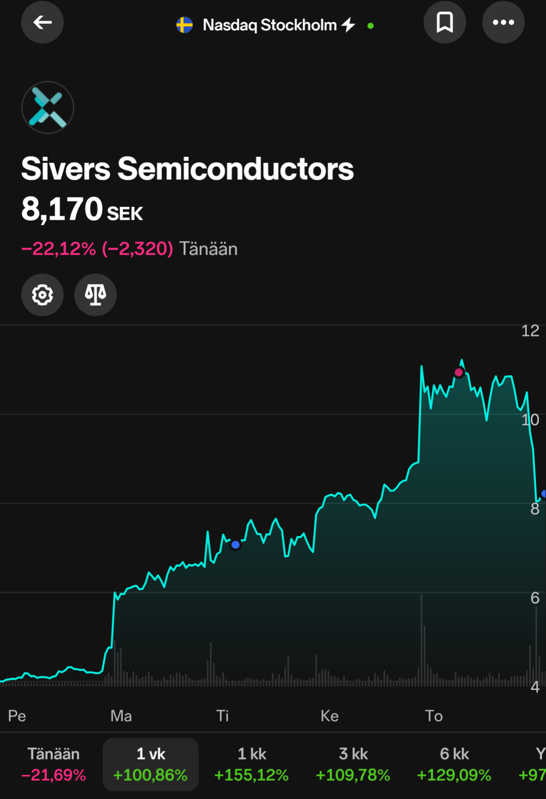 Sivers Semiconductors -20% today. Let’s see if my timing for buys and sells was successful. I bought on Tuesday, sold yesterday, and bought back today.