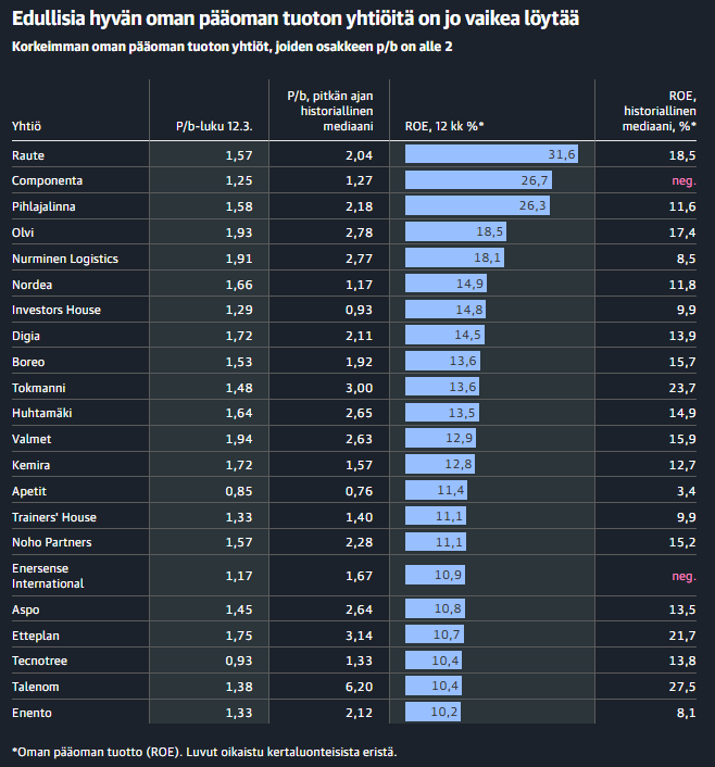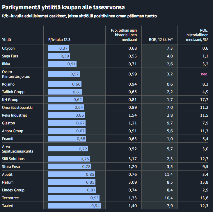 Kauppalehti, as is its custom, reminds us that there are several Finnish companies trading below their book value, perhaps some for good reason.