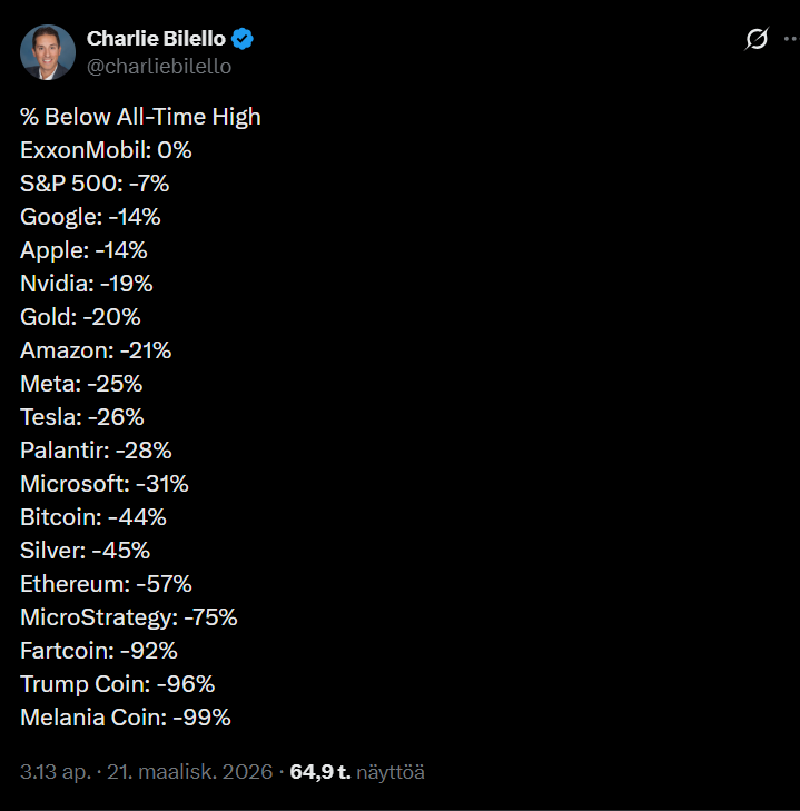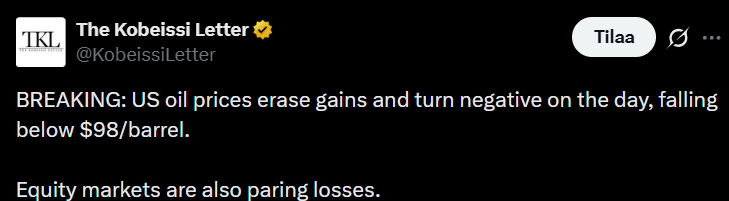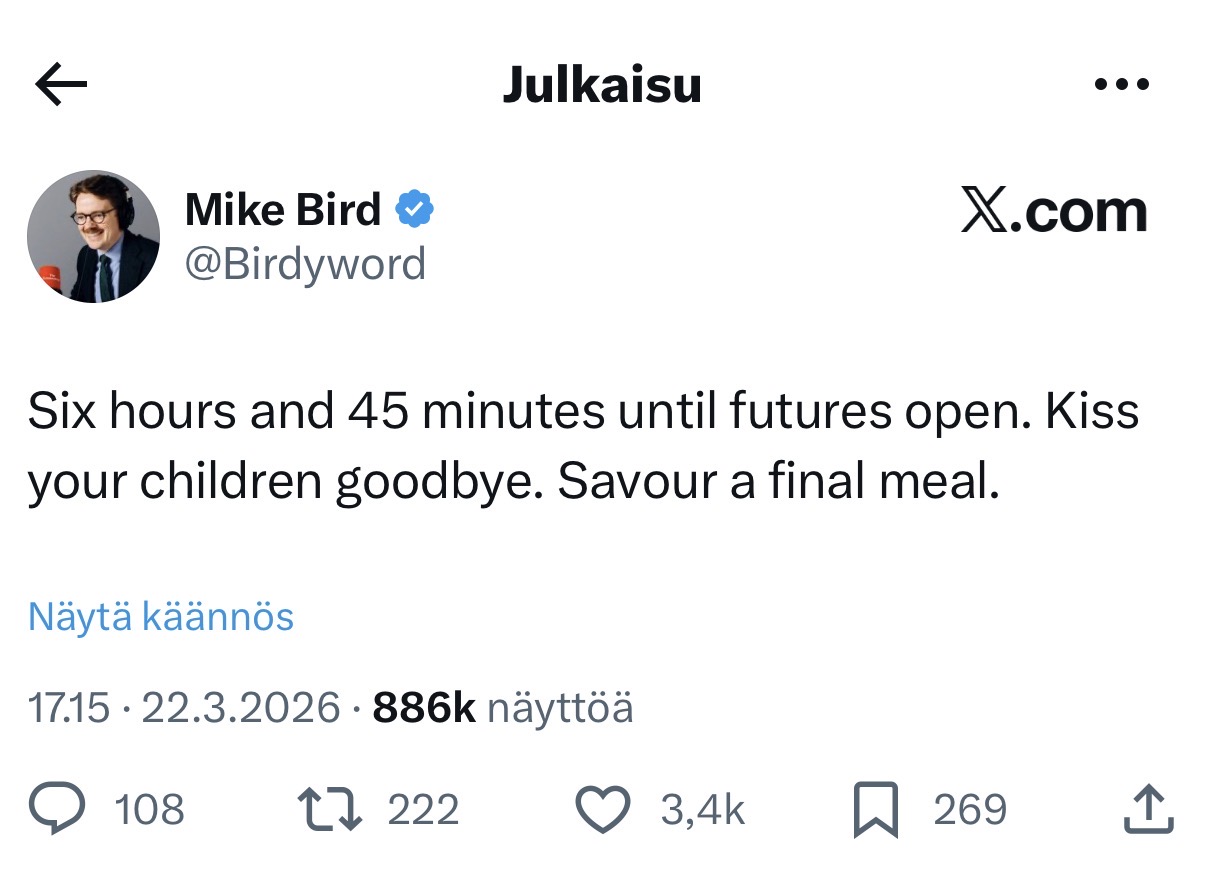 YLE: # Jos Trump ei peru uhkaustaan, ”edessä on musta maanantai”, ennustaa markkina-analyytikko 22.3.2026.