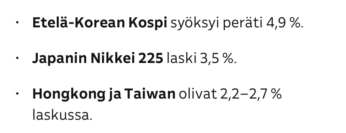 Vasta laskettu Nikkei 225:ssä viime joulukuun tasolle suunnilleen. Tämän vuoden nousu syöty pois, mutta ei muuta. Tällä hetkellä n. 51500 pistettä. Kävi viime kevään tariffikriisi aikaan vain reilussa 31000:ssä pisteessä.