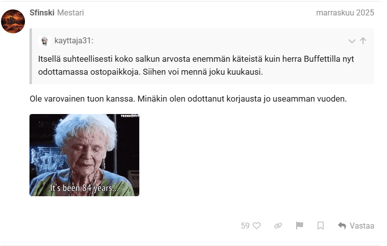 Itse Warren Buffet on puhunut ajoittamisen vaikeudesta, mutta hän ei olekaan vaan hoksannut että pienen reunamarkkinan sijoitusfoorumin sentimentti on huipputyökalu ostojen ja myyntien ajoituksessa ![]()
